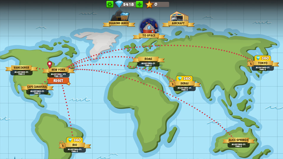 Lorsque vous atteignez 20% des jalons la première fois, la carte du monde du jeu se déverrouille. Ici, vous pouvez voyager dans de nouvelles villes du monde entier et y construire une nouvelle tour. Cela coûte des diamants pour débloquer une nouvelle ville, mais vous pouvez ensuite y construire votre tour autant de fois que vous le souhaitez. Si l'une de vos tours atteint des jalons de 100% et 100% dans le fichier d'étages, vous aurez la possibilité de la réinitialiser. Si vous le faites, vous perdrez tout votre honneur et devrez tout recommencer sur la prochaine tour de la ville. En retour, vous obtenez une étoile, et à long terme, les étoiles peuvent devenir très précieuses.