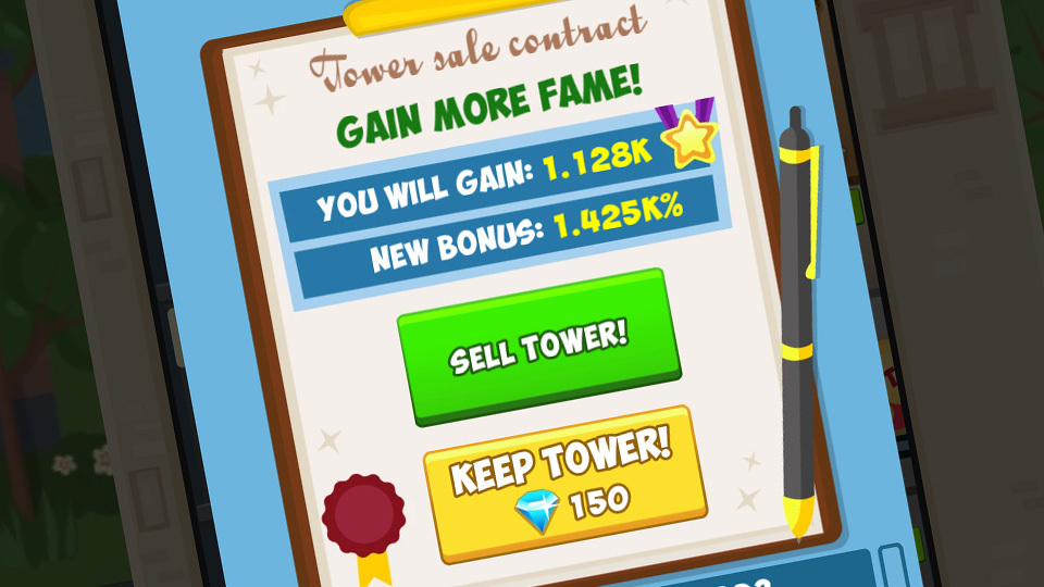 Lorsque les revenus de votre tour commencent à ralentir, c'est une bonne idée de vendre la tour. Ce faisant, vous obtenez des honneurs qui feront que votre prochaine tour gagnera plus d’argent. Si vous avez joué à Farm Empire, les honneurs sont similaires à ceux de ce jeu. Les honneurs peuvent également être utilisés pour les mises à niveau, mais soyez prudent - si vous passez tous vos honneurs sur des mises à niveau, vous ne pourrez plus augmenter vos revenus.